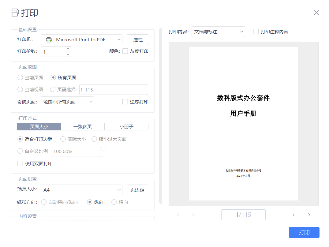 支持打印的基础设置,如指定打印机,打印份数,是否采用灰度打印,支持指定打印的页面范围,支持打印方式的指定,页面设置和内容设置等,可以选择打印内容,如“仅文档”,“文档与标注”,支持打印页面的预览等。